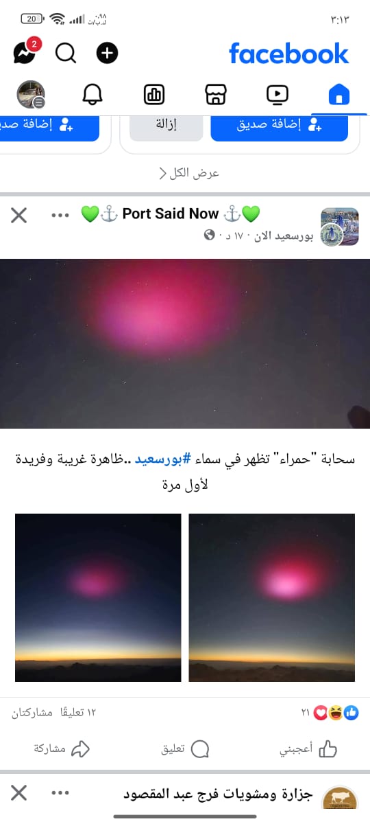ظهر أمس سحابه حمراء فوق بورسعيد ،شاهد سكان المحافظه السحابه الحمراء بوضوح ،وتردد بين المواطنون اشاعات كثيره منها إشارات لحدوث زلازل الاان علماء البحوث الفلكيه والجيوفيزيقيه خاصة في جروب