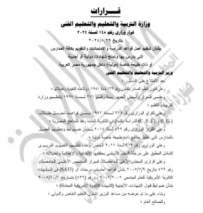 نشرت الجريدة الرسمية قرار محمد عبد اللطيف وزير التربية والتعليم والتعليم الفني، بشأن تنظيم عمل قواعد الدراسة والامتحانات والتقويم، بجميع المدارس التي يدرس بها وتمنح شهادات دولية أو أجنبية أو ذات طبيعة خاصة دولية داخل جمهورية مصر العربية